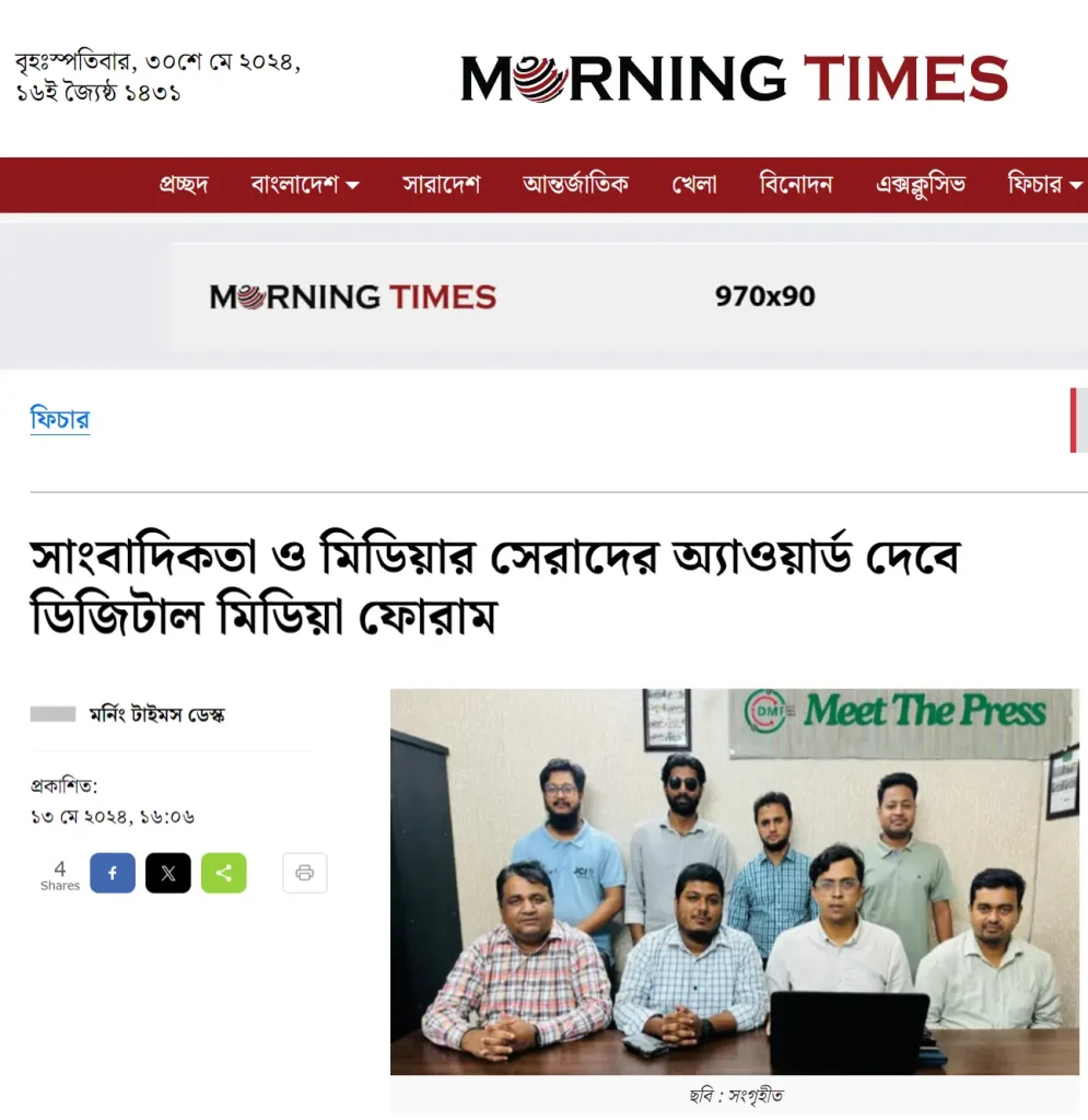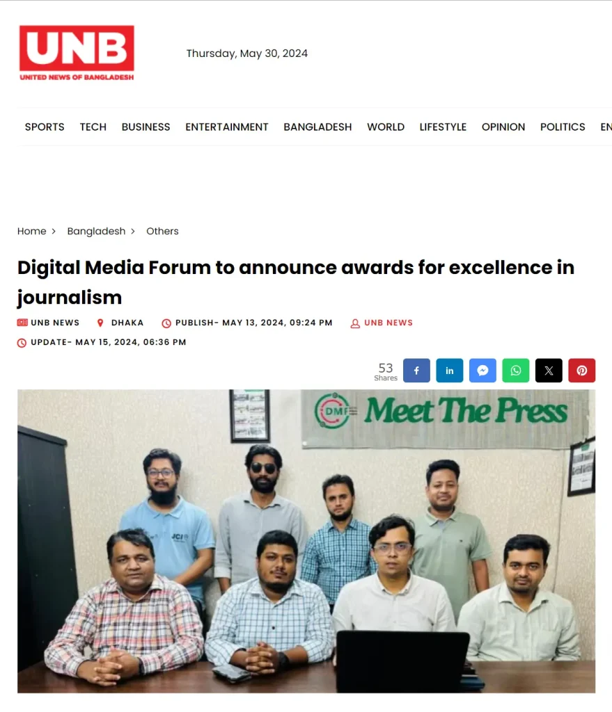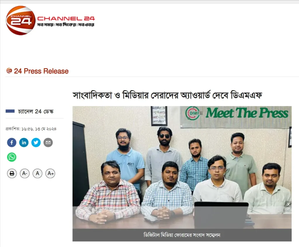 ডিজিটাল মিডিয়া ফোরাম (ডিএমএফ) আগামী জুন মাসে ‘ডিজিটাল মিডিয়া এক্সিলেন্স অ্যাওয়ার্ড ২০২৪’ আয়োজনের ঘোষণা দিয়েছে। রবিবার (১২ মে) সন্ধ্যায় সংগঠনের মহানগর অফিসে এক সংবাদ সম্মেলনে এ তথ্য জানানো হয়।